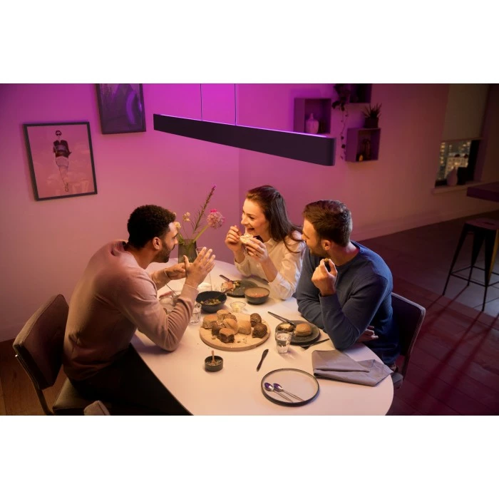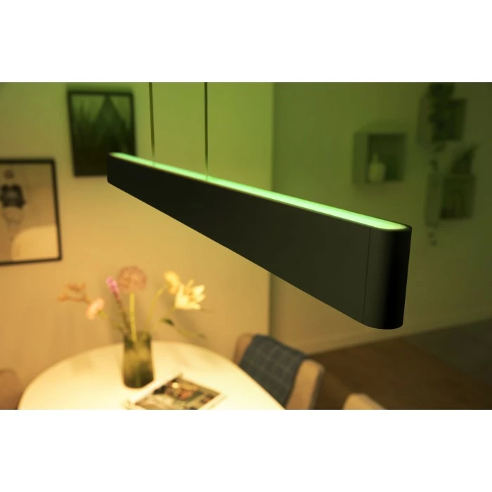 Designstarke Pendelleuchte für den Esstisch mit zwei integrierten LED Strips zur Beleuchtung des Tisches und des Deckenbereichs, Die Farbgebung und Steuerung beider LED Strips sind individuell, sowie gemeinsam einstellbar, Vereint funktionale sowie stimmungsvolle Beleuchtung (Auf den Esstisch gerichtetes Licht, sowie ein Oberlicht für ein farbiges, stimmungsvolles Ambiente), Spielen Sie mit Licht und wählen Sie eine aus 16 Millionen Farben in der Hue App passend zu Ihrer Stimmung, Synchronisieren Sie Ihr Licht mit Musik/ Filmen und Spielen, zwei neine Hue WACA LED Strips sind im Lieferumfang enthalten; Steuerung über Bluetooth und Bridge